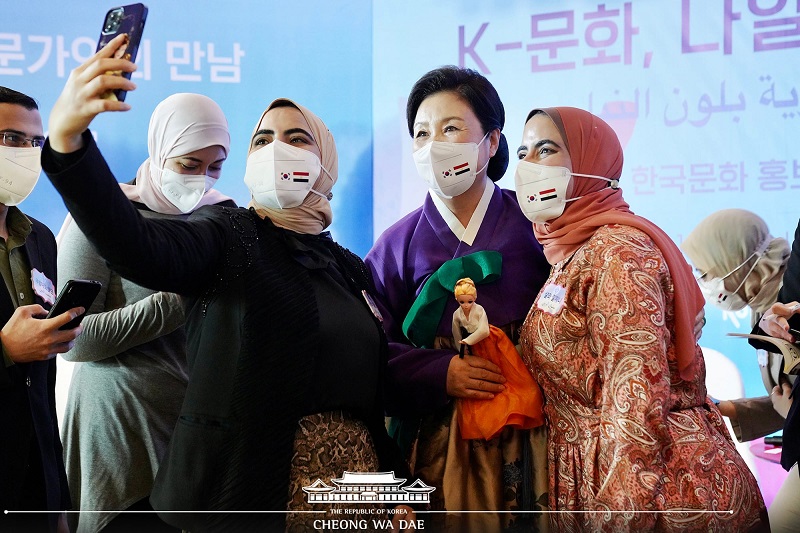 In an event organized by the Korean Culture and Information Service (KOCIS) in Cairo, Egypt, Korean first lady Kim Jung-sook on Jan. 20 met K-influencers and Korea.net Honorary Reporters there. Called "K-culture, colored with the Nile," the event was part of her visit to Egypt along with the president.